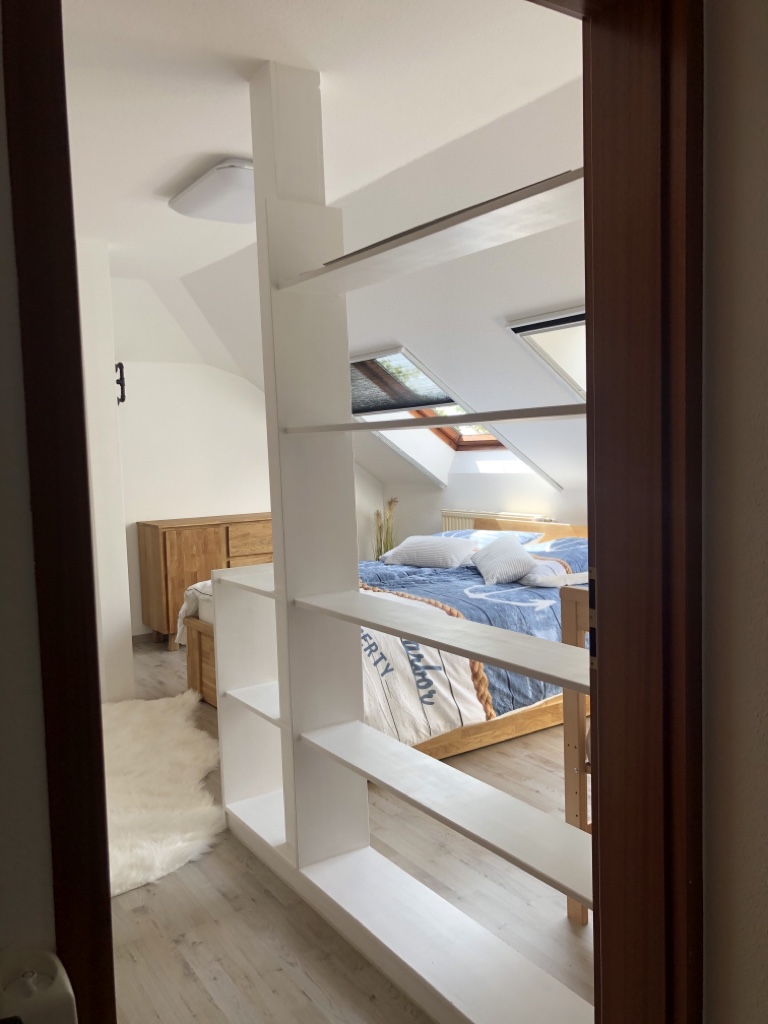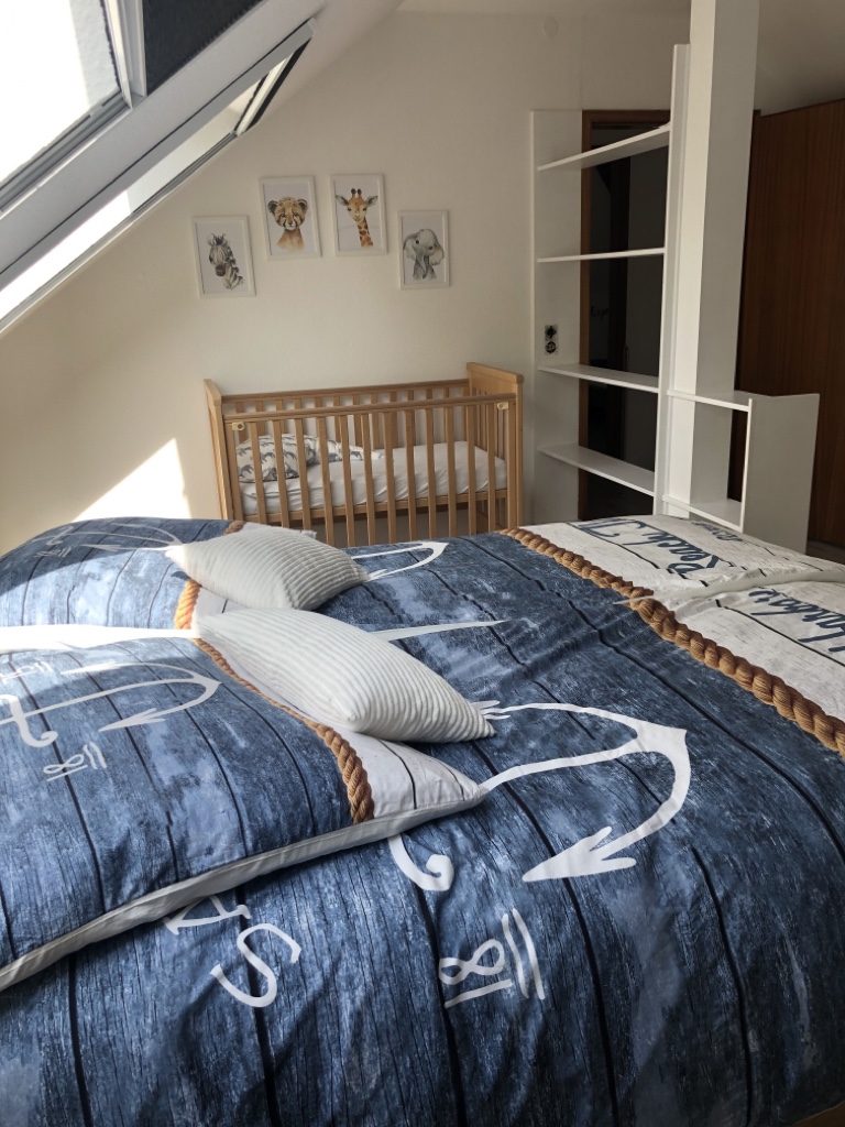 Es verfügt über ein 160x200cm großes Doppelbett und ein Beistellbett ca.70x120 mit normaler Matratze. Das Schlafzimmer hat an den Dachfenstern Insektenschutz und Verdunklungsrollos.