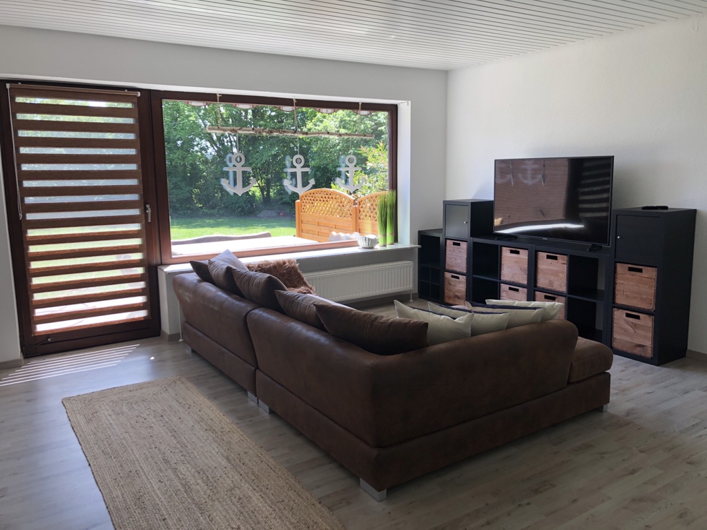 Das Wohnzimmer verfügt über eine großes Sofa mit Sitzgelegenheit für 6 Personen und einer kleinen Entspannungsecke. Der 55 Zoll Fernseher hat einen Amazon FireTV Stick und WLan.